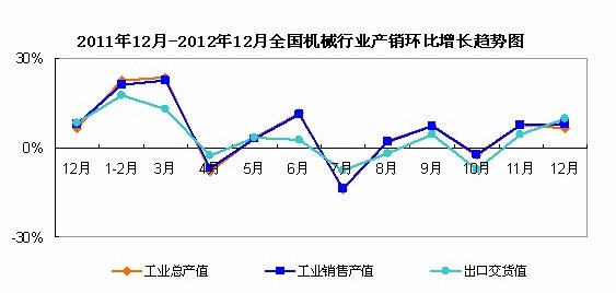 統(tǒng)計(jì)數(shù)據(jù)顯示,2012年1-12月,全國(guó)機(jī)械工業(yè)經(jīng)濟(jì)運(yùn)行速度同比持續(xù)呈現(xiàn)回升的態(tài)勢(shì)。12月份,工業(yè)總產(chǎn)值的累計(jì)同比增速為14.24%;工業(yè)銷售產(chǎn)值的累計(jì)同比增速為14.64%,出口交貨值的累計(jì)同比增速為3.26%。