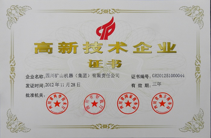 日前,從省有關(guān)部門獲悉,四川礦山機器(集團)有限責任公司喜獲“高新技術(shù)企業(yè)”稱號,并頒發(fā)了榮譽證書。