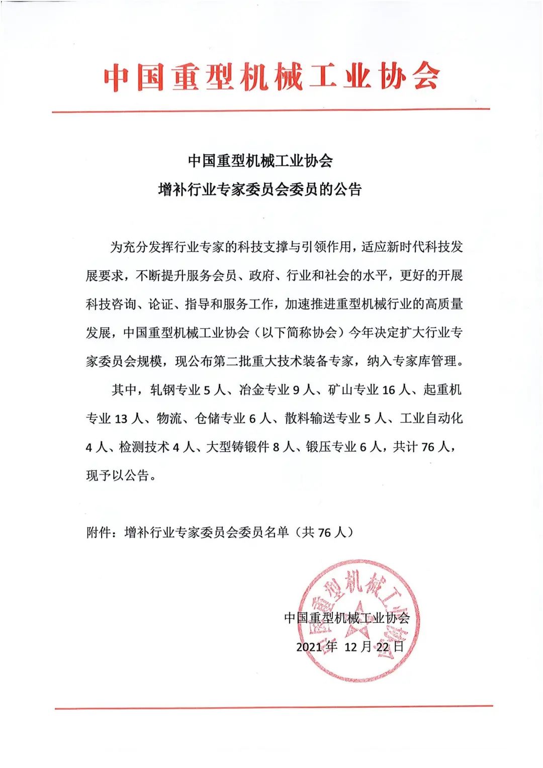 中國(guó)重型機(jī)械工業(yè)協(xié)會(huì)增補(bǔ)行業(yè)專(zhuān)家委員會(huì)委員的公告