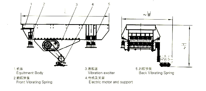 振動給料機(jī)是由給料槽體、激振器、彈簧支座、傳動裝置等組成。槽體振動給料的振動源是激振器,激振器是由兩根偏心軸(主、被動)和齒輪副組成,由電動機(jī)通過三角帶驅(qū)動主動軸,再由主動軸上齒輪嚙合被動軸轉(zhuǎn)動,主、被動軸同時反向旋轉(zhuǎn),使槽體振動,使物料連續(xù)不斷流動,達(dá)到輸送物料的目的。